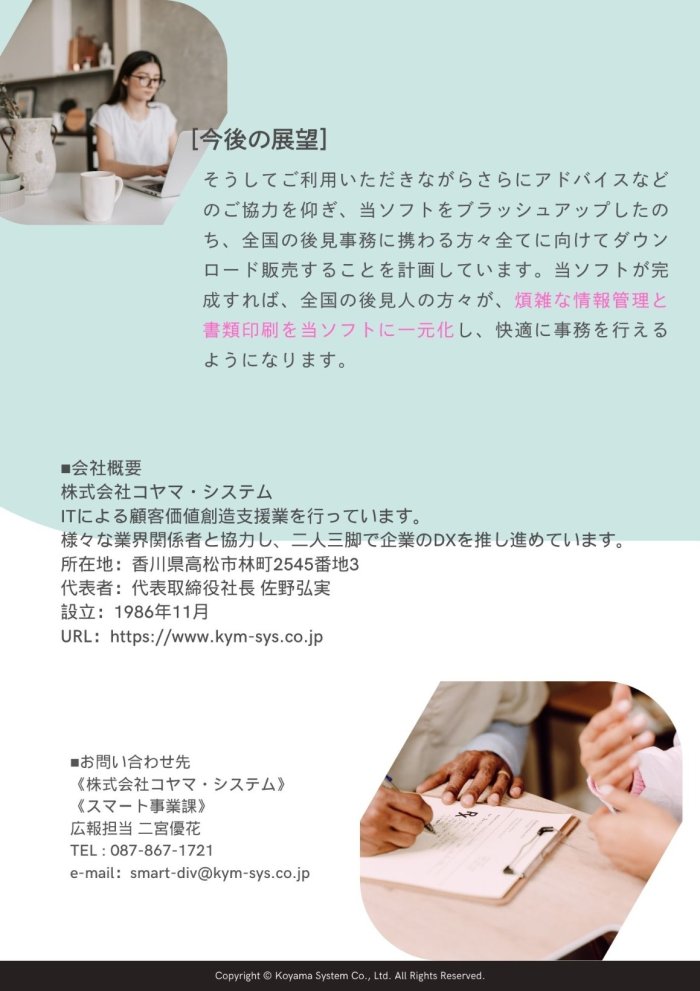 【新サービス】「ケアサポ」が新しく誕生しました 2024年11月25日(月) プレスリリース 地元の社会福祉士さんと協力して作る、日々の後見事務の記録や裁判所提出書類の作成を簡単にする優しいソフトウェア「ケアサポ」 ご不明な点がございましたら、お気軽にご相談ください。→ご相談はコチラ