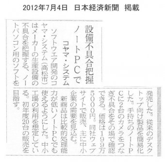 RekamoMA-MEM-02が日本経済新聞に掲載されました。 2012年07月04日(水) プレスリリース ノートPC版高速モーションレコーダー RekamoMA-MEM-02が日本経済新聞に掲載されました。 (画像をクリックで拡大表示) 多数 お問合せ頂いております。 生産現場の原因追求にご活用ください。 商品の詳細は こちら